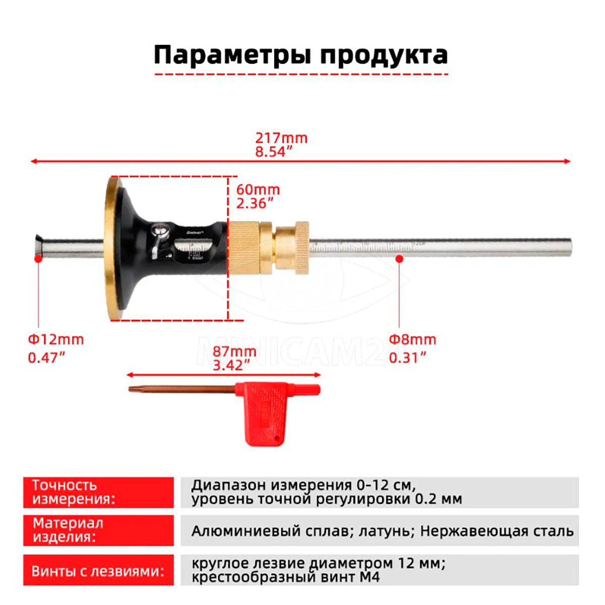 Лезвие изделия изготовлено из алюминиевого сплава, стержень ручки изготовлен из нержавеющей стали, а регулировочная ручка изготовлена из латуни, что позволяет эффективно продлить срок службы изделия. Шкала делает измерения более точными.
