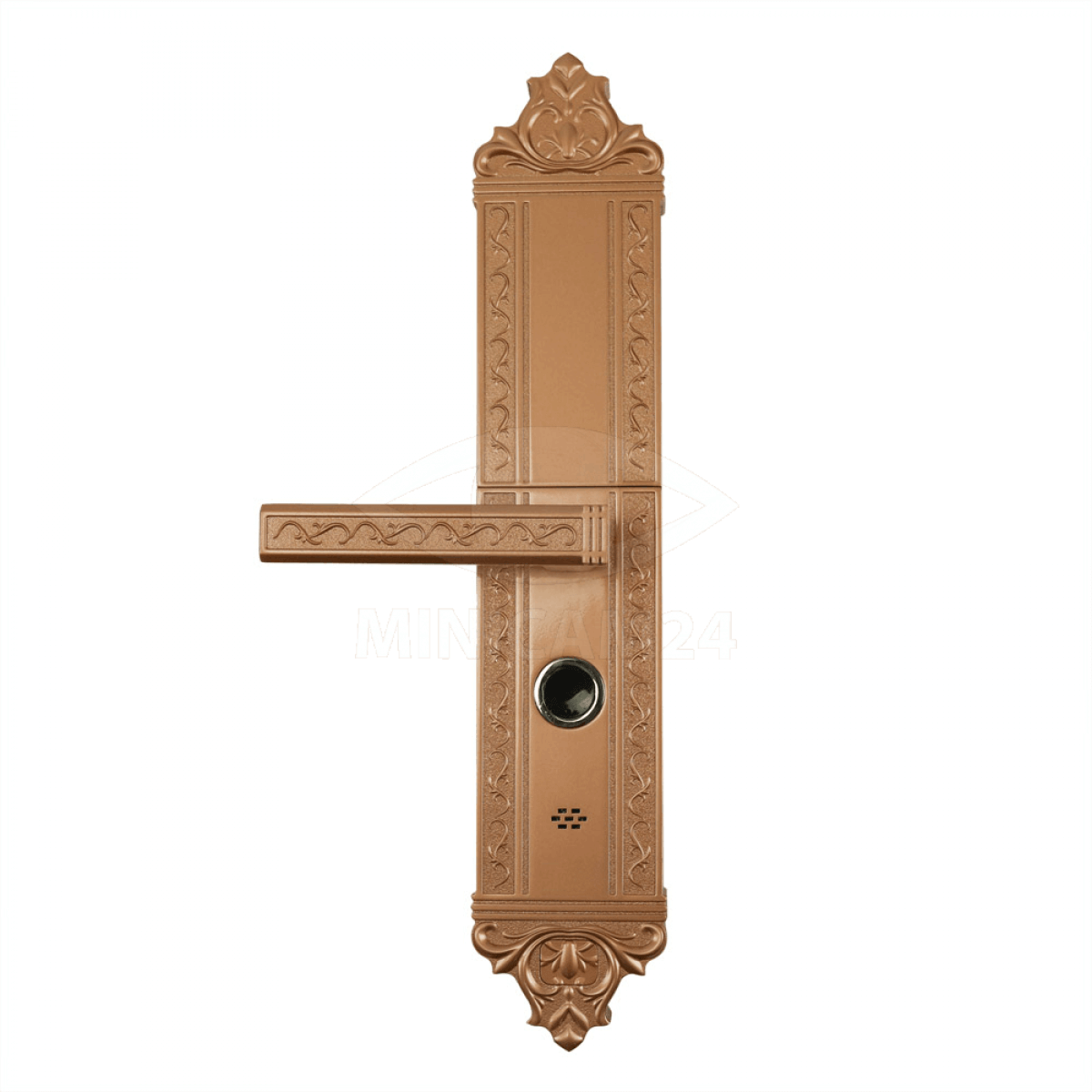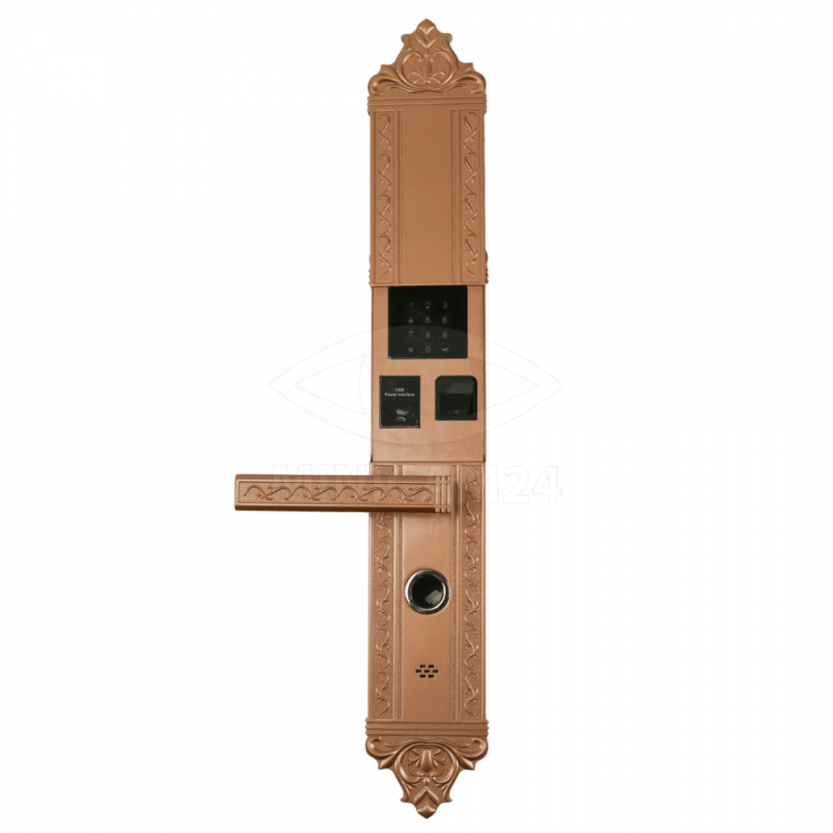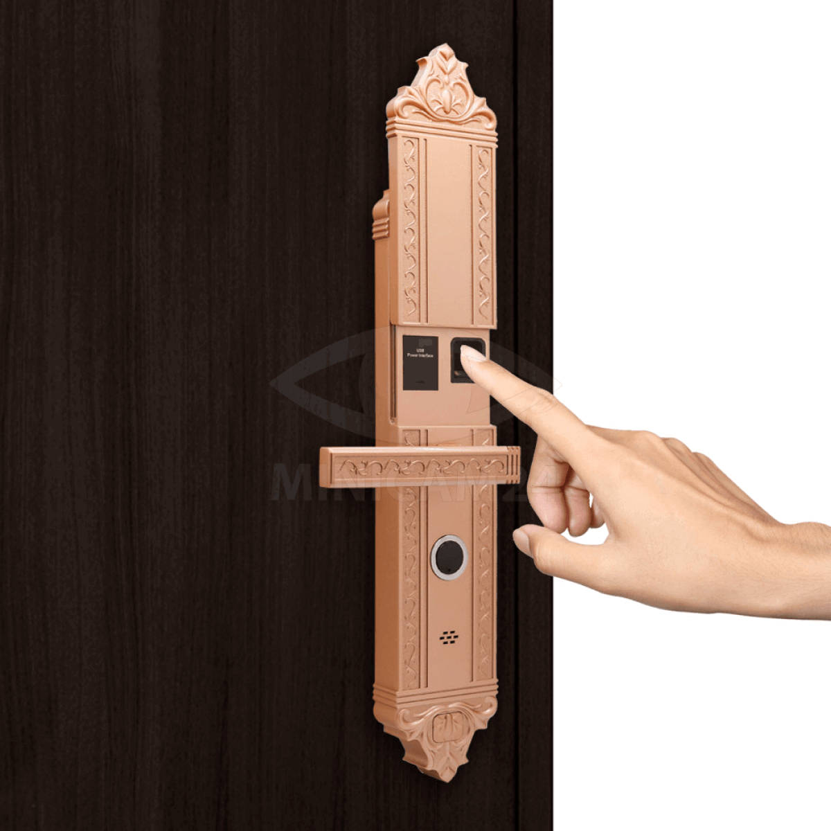 Врезной замок из нержавеющей стали, устанавливаемый непосредственно в дверное полотно толщиной от 50 до 110 мм. Замок разблокируется по отпечатку пальца, паролю, ID карте или механическому ключу. Замок хранит в памяти 200 карт и 100 отпечатков. Независимое питание замка четырех батареек формата АА обеспечивает до 5000 открываний двери.