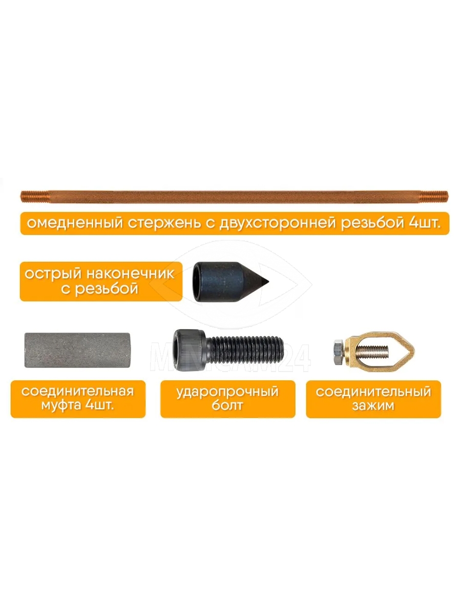 Особое внимание уделено простоте монтажа комплекта. Острый наконечник с резьбой позволяет легко и быстро установить стержни в грунт, независимо от его типа. Это делает комплект универсальным решением для использования в различных конструкциях и на любых участках, обеспечивая надежную защиту от статического электричества и других электрических воздействий.